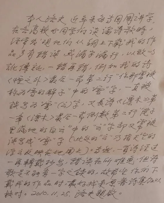 这则声明后来还发表在2011年1月13日《衡阳晚报》。洛夫的这种诗在刊登与传播过程中,遭遇到的因抄错、印错而产生以讹传讹、一错再错的情况,我也深有体会,尤其是诗的分段方面,是最容易失误的。有的报刊由于版面原因,为了压缩行数,往往把分段连起来,严重地破坏了诗的整体阅读节奏感,甚至诗意连接也增加了分裂感;还有就是公众號转载诗作,也许是软件系统自动生成,往往分段的诗变成了不分段;简体字转换繁体字或繁体字转换简体字方面,同样经常会出错。