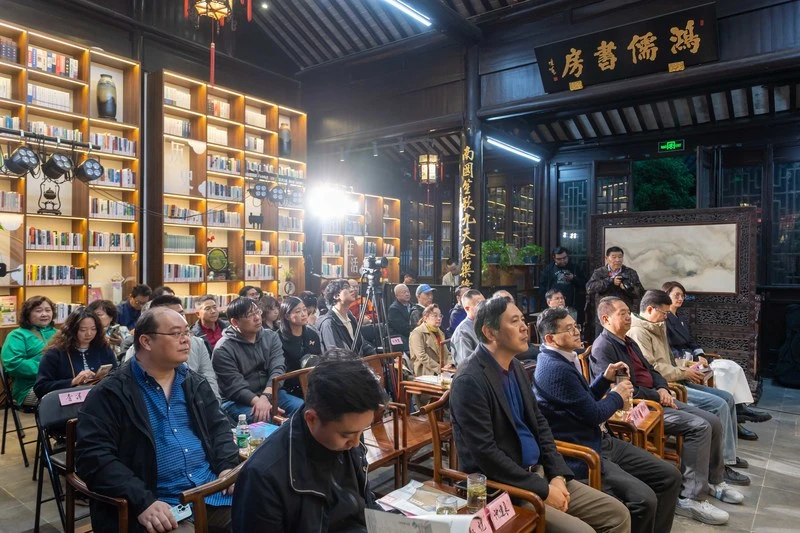 没有传统音乐会的舞台隔阂,鸿儒书房内灯光温润,书架上墨香浮动,观众们围坐其间,氛围亲切。